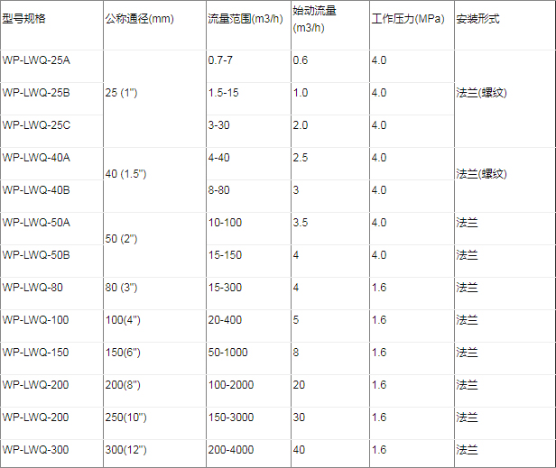 2.测量范围及工作压力:表2(注:表2所示测量范围均为工作状态下流量范围)