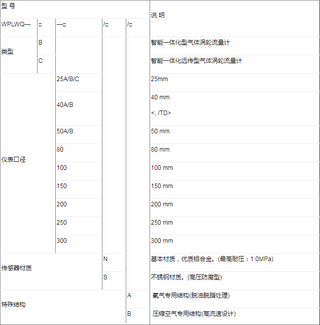 例:选用一台不锈钢材质,现场显示并输出4-20mA信号的气体涡轮流量计来测量氧气,用户测量范围为10-35m3/h,型号为: WPLWQ-C-40A/S/A