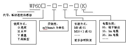 表示:WP60振动速度传感器,水平方向安装,灵敏度20mV/mm/s,M10×1双头螺栓安装,接头输出,不带电缆铠装。
