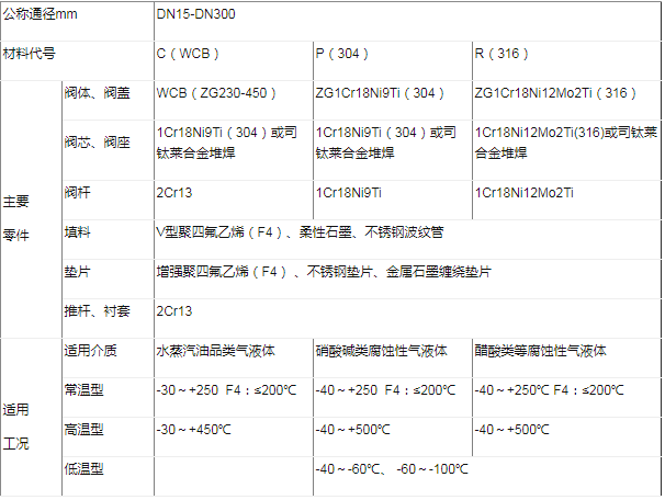 有标准型、波纹管密封型、夹套保温型等品种。产品压力等级有PN1.6 4.0 6.4MPa;公称通径DN25~300mm;适用流体温度有-100~+500℃;按温度高低配用不同阀盖可分常温型、高温型和低温型。