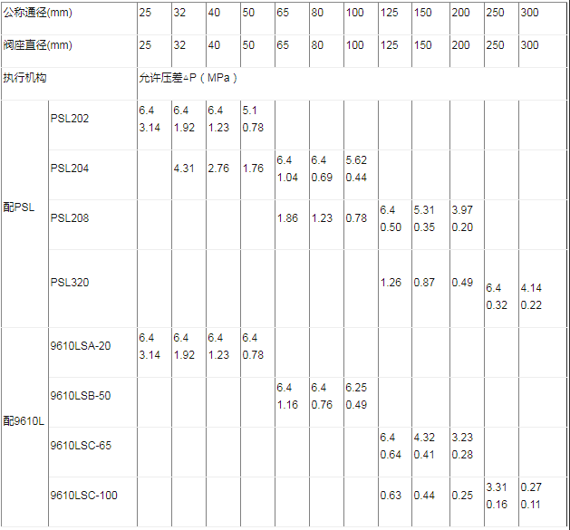 允许压差 MPa(同一格内上行为双密封型允许压差,下行为单密封型允许压差)