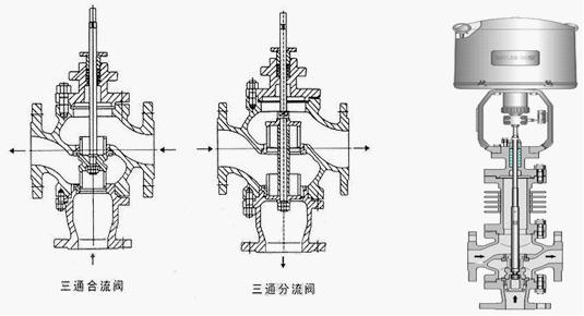 三通调节阀有三通合流式调节阀(把两种流体经三通阀混合成一种流体)和三通分流式调节阀(把一种流体经三通阀分成两路流出)两种形式。当公称通径DN≤80mm和压差较小的场合时,分流阀可以采用同口径的合流阀代替。流量特性有直线性、抛物线性两种。