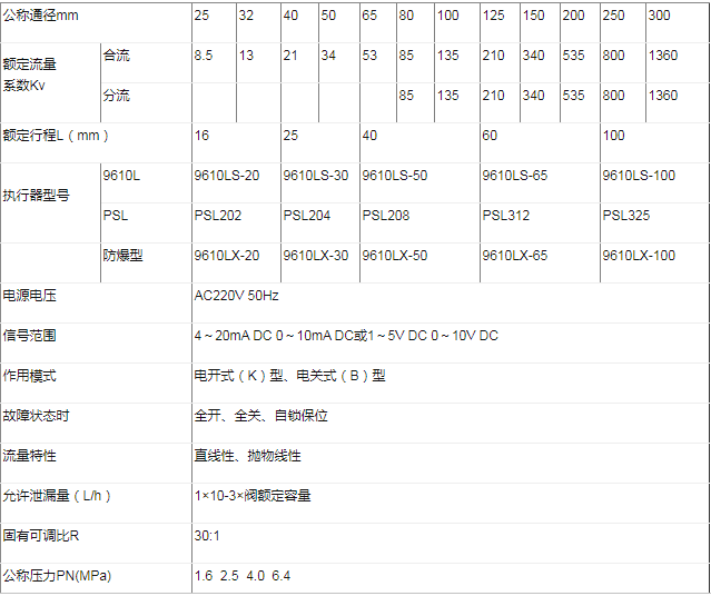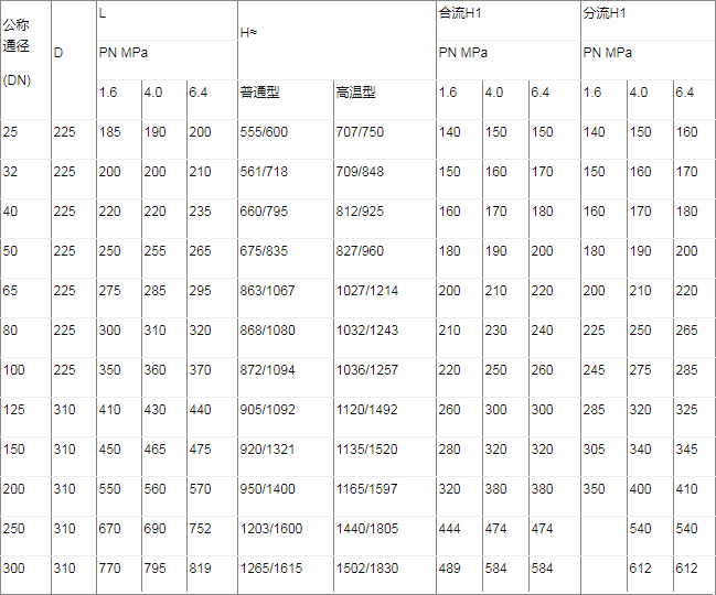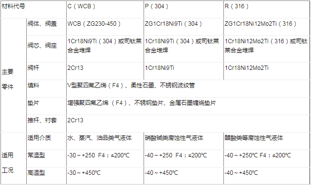 产品压力等级有PN1.6 4.0 6.4MPa;公称通径DN25~300mm;适用流体温度有-40~+450℃;按温度高低配用不同阀盖可分常温型、高温型两种。